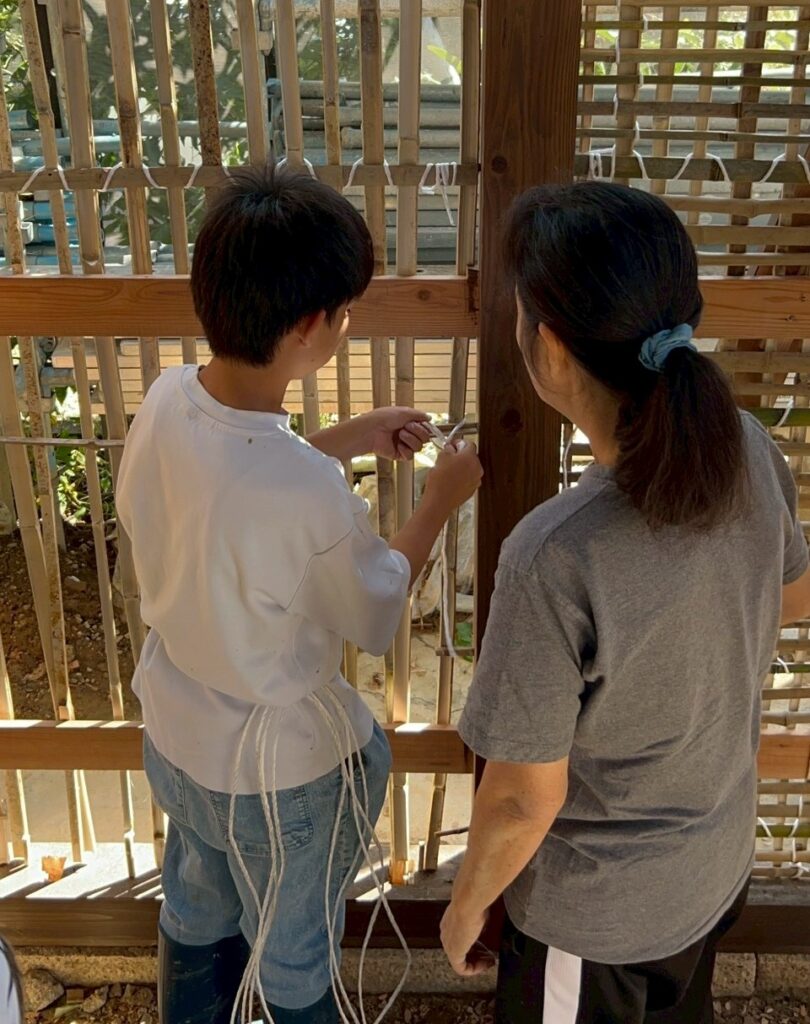 竹小舞は、土壁の土台となる部分で、竹を割って格子状に編み込んでいく作業です。まず左官職人が、縦の竹を固定するための竹くぎを柱に打ち付けます。その竹くぎを目印にして縦竹を取り付けていき、私たち素人は、その縦竹に横の竹を編み […]