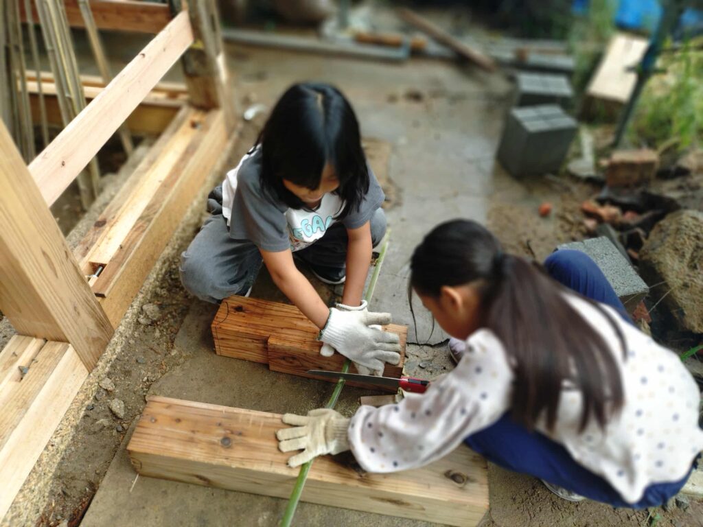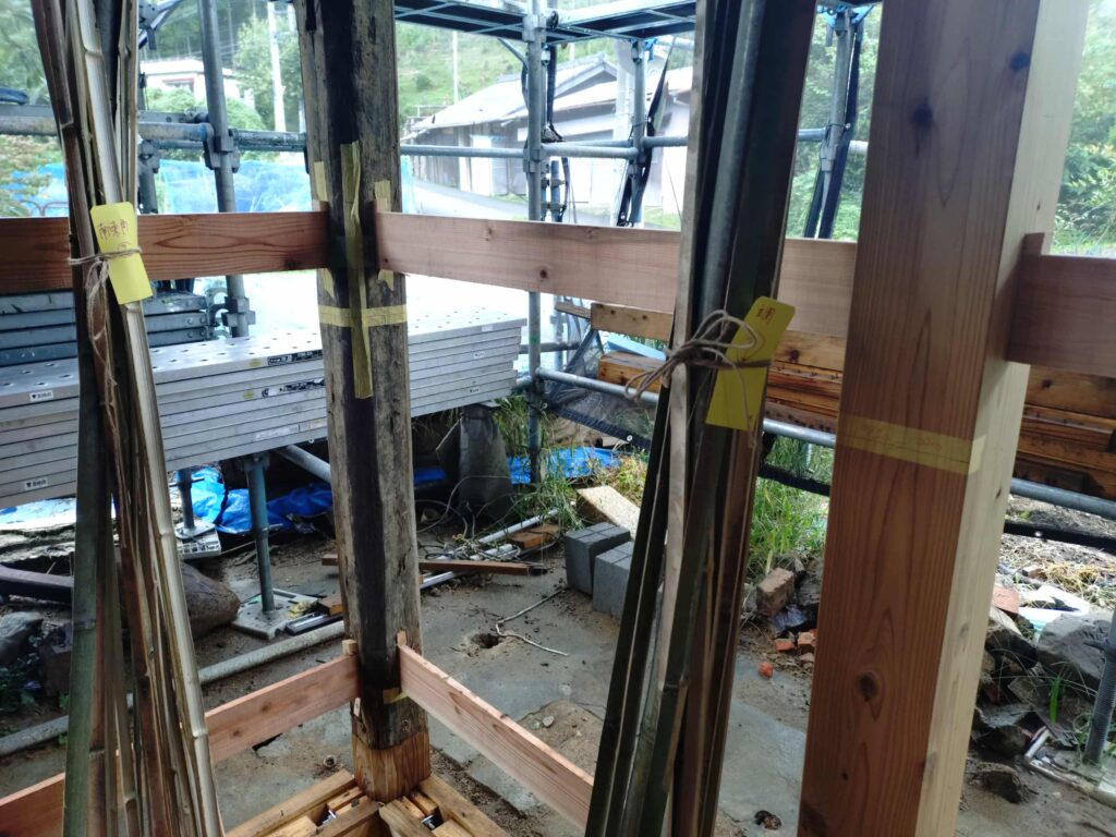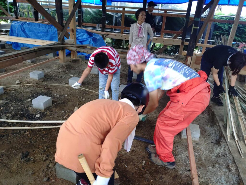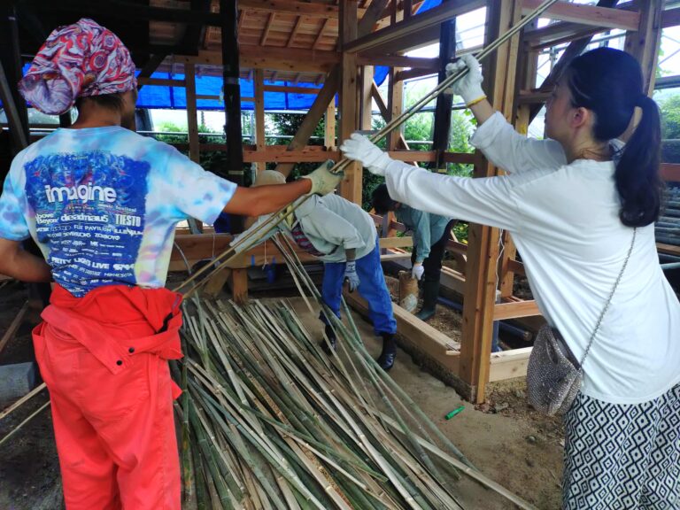 途中雨が降りましたが、屋根がついたので全天候の作業場となり、本日の作業は予定時刻より早く完了しました。そして、左官職人はすべての壁に竹くぎを打ち終わっていました‼ 参加の皆様、職人さnお疲れさまでした。(YN)