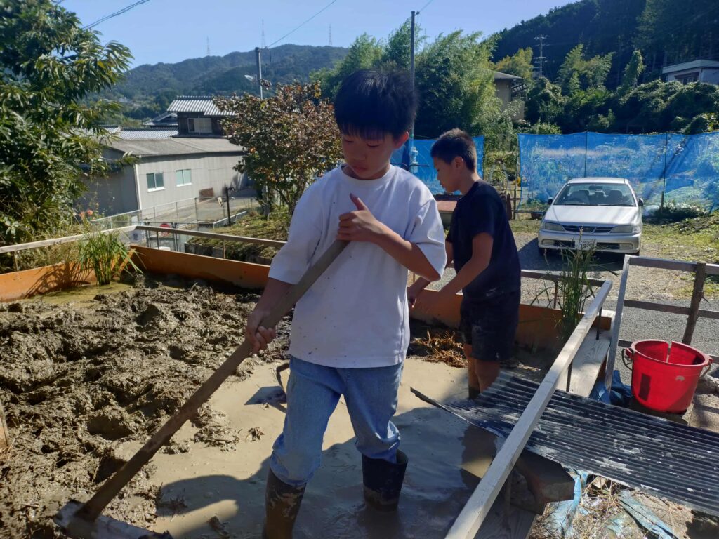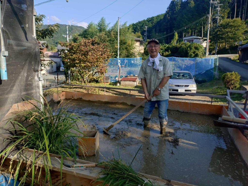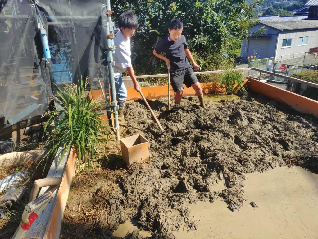 さて、体力が勝負の土練り。春に壁から落とした土をプールに入れ発酵させること半年、天地返しをしながら、さらに藁と水を入れながら練っていきます。職人さんのOKがでるまでの練り作業です。