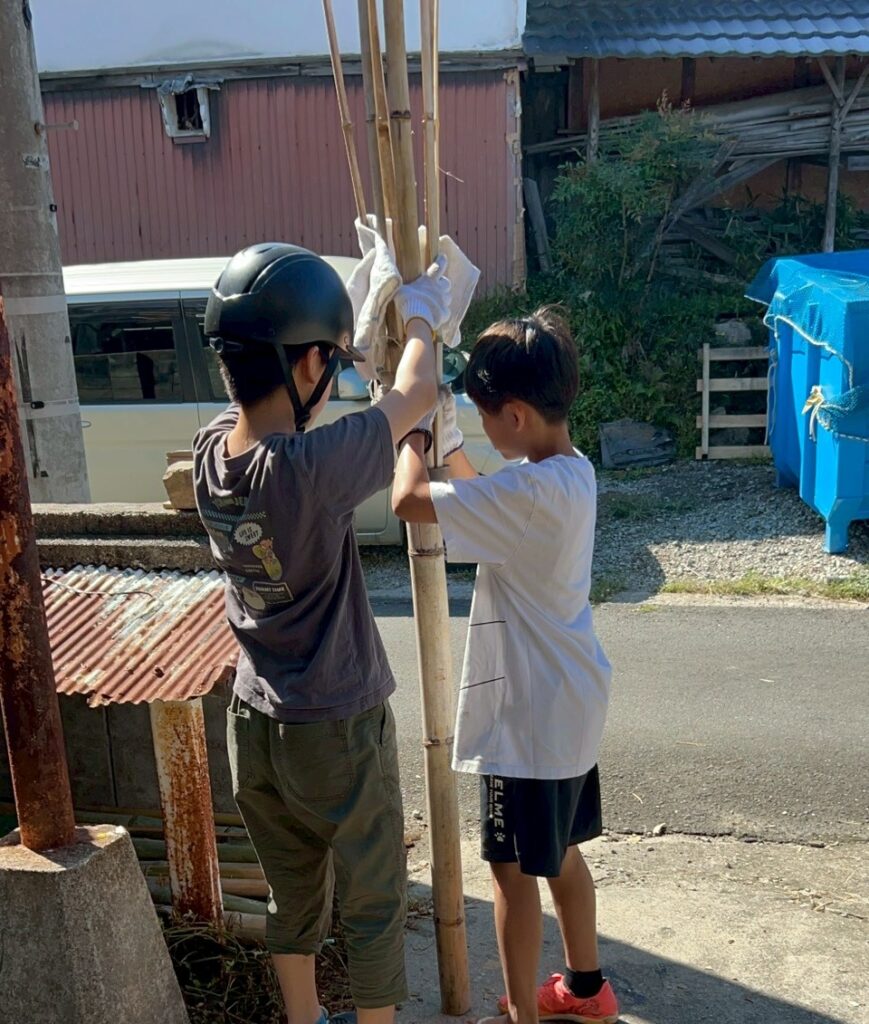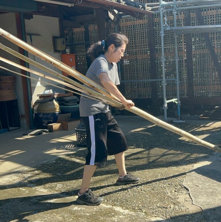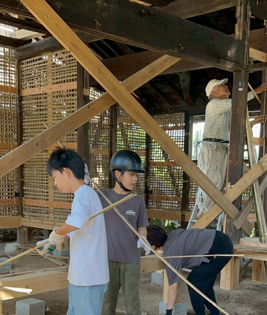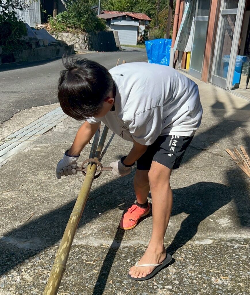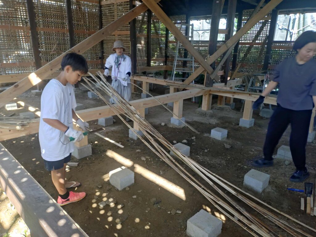 最初に、柱の高さに合わせて縦竹の長さを揃えます。竹を割り、節を取り、長さを調整して切る――。それぞれの工程を分担しながら、みんなで竹小舞を編んでいきます。