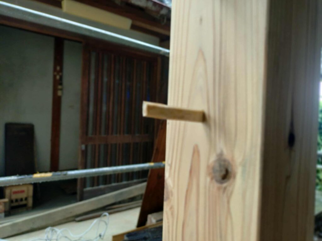 まず左官職人が、縦の竹を固定するための竹くぎを柱に打ち付けます。その竹くぎを目印にして縦竹を取り付けていき、私たち素人は、その縦竹に横の竹を編み込んでいきます。